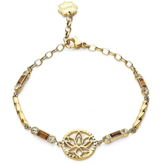 Bracciale Brosway in acciaio 316L e finitura color oro con fiore di loto, cristalli golden shadow, light gold quartz e smoked topaz.