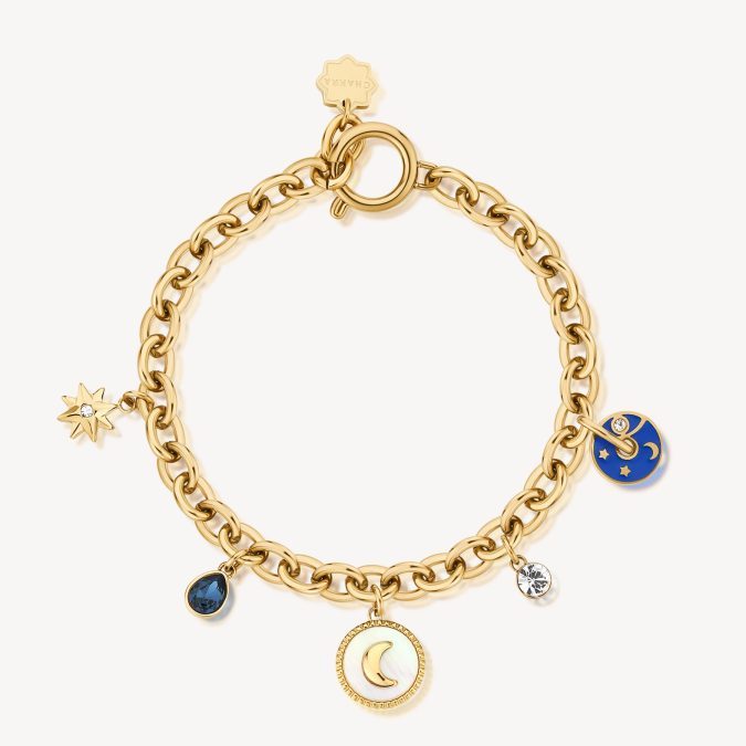 Bracciale Brosway in acciaio 316L e finitura pvd oro 14K con pendenti tema astri, madreperla, smalto blu, cristalli chiari e colore montana.