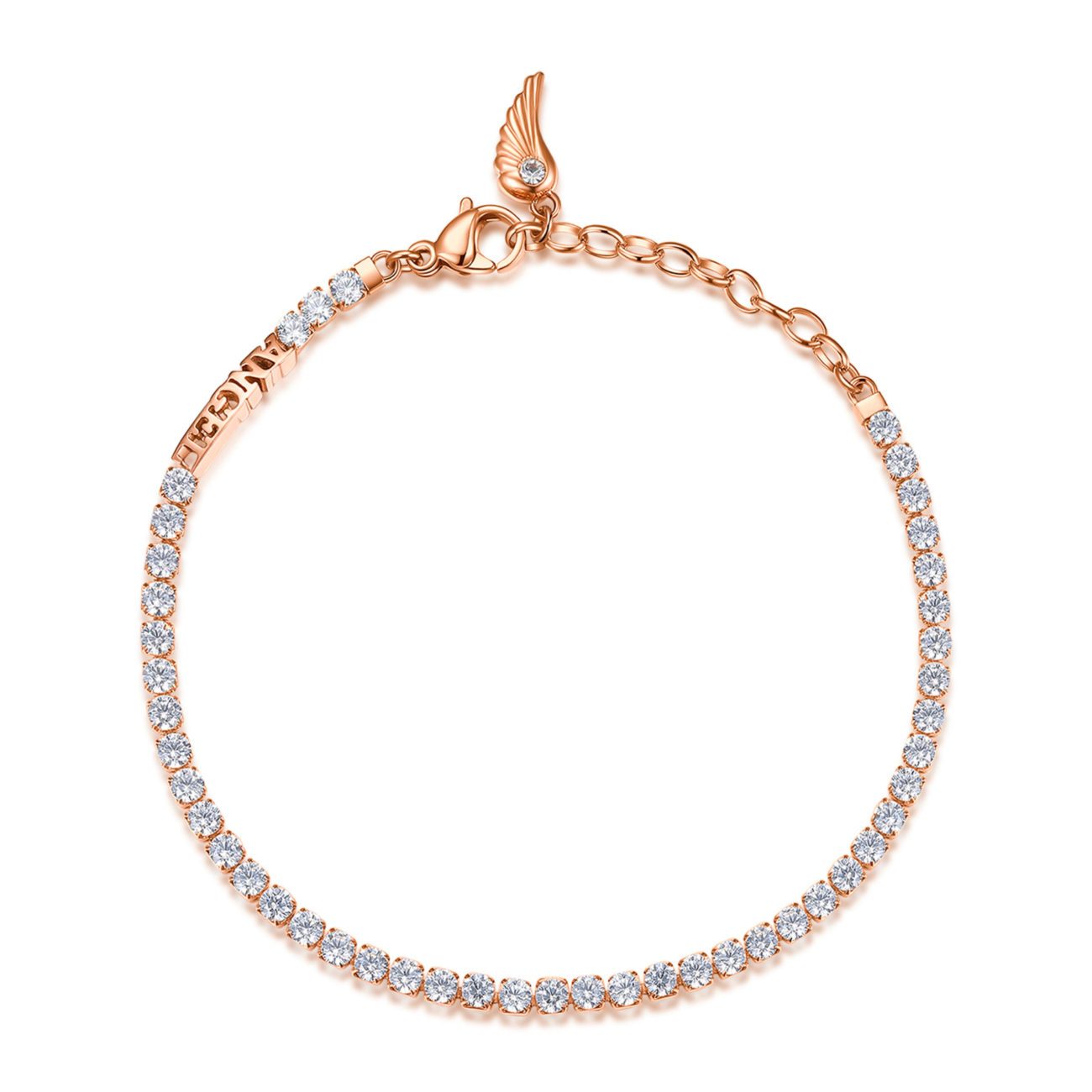 Bracciale Brosway tennis in acciaio 304 e pvd oro rosa, cubic zirconia bianchi con scritta angel e pendente chiusura con ala e cristallo crystal.