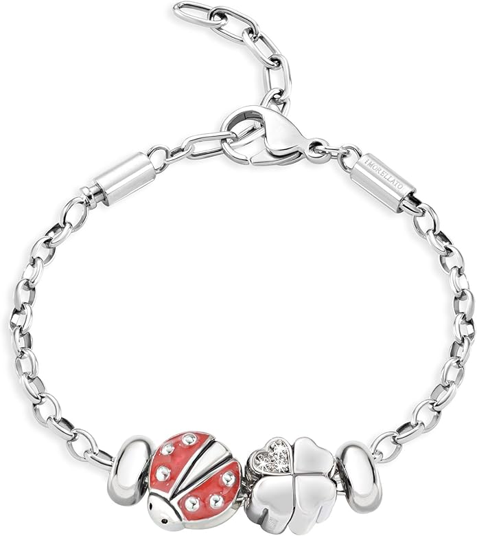 Bracciale Morellato realizzato in acciaio , ha come ciondoli una coccinella e un quarifoglio con sopra degli zirconi bianchi.