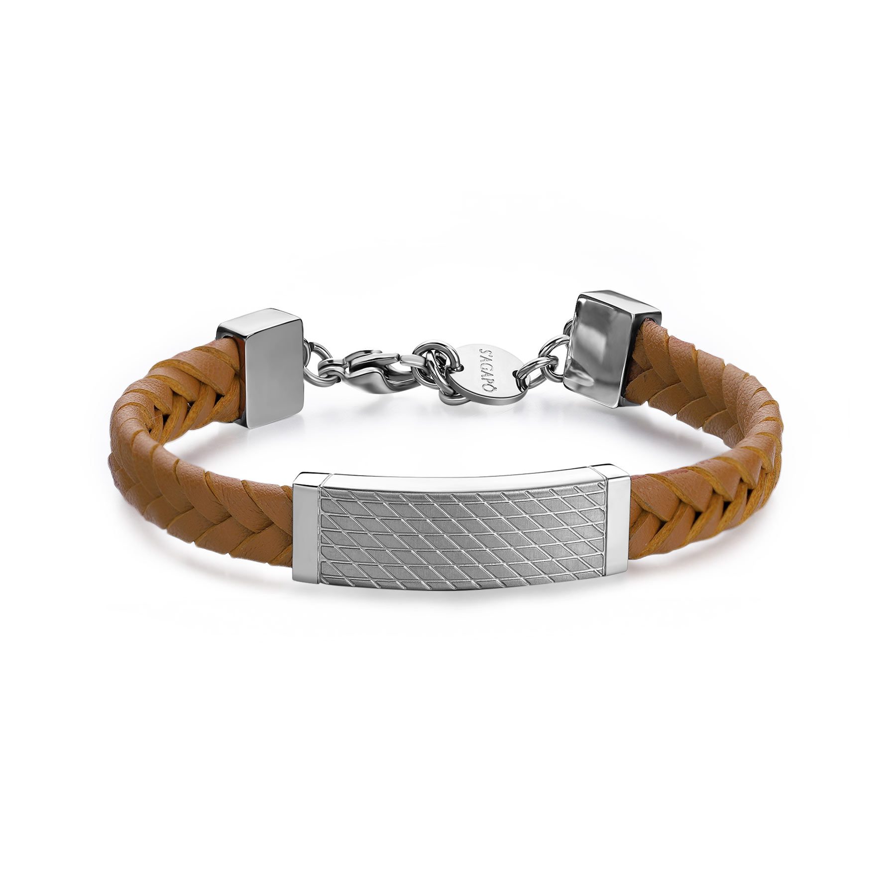 Bracciale S’Agapò in pelle sintetica marrone intrecciata con centrale in acciaio 316L e incisioni.