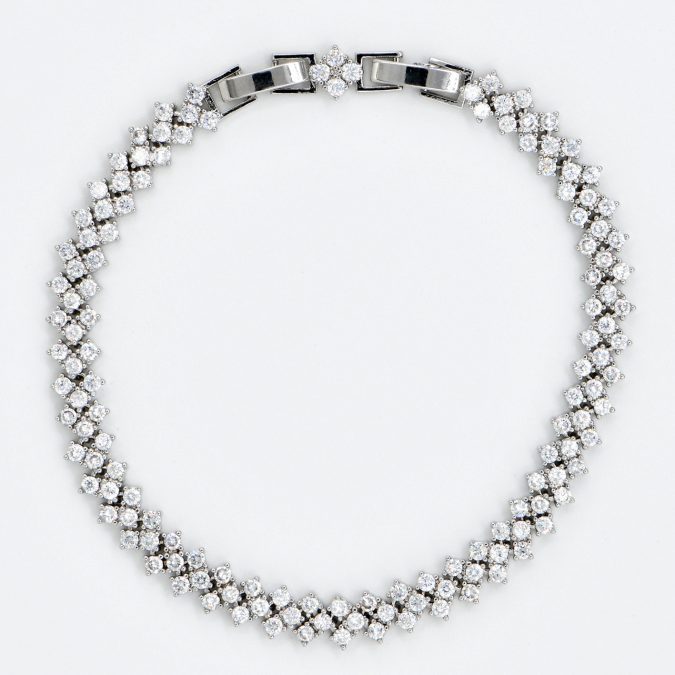 Bracciale tennis in ottone argentato con i riporti in strass bianchi a spina di pesce, nickel nei termini di legge.