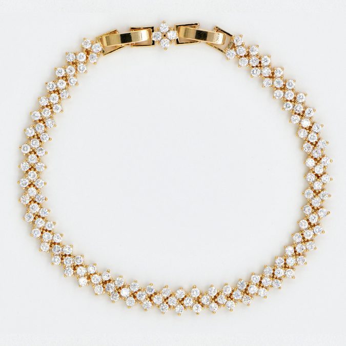 Bracciale tennis in ottone dorato con riporti in strass bianchi a spina di pesce, nickel nei termini di legge.