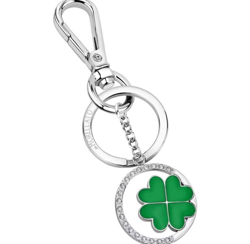 Portachiavi Morellato realizzato in acciaio, ha come simbolo un quadrifoglio smaltato verde con degli zirconi bianchi.
